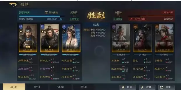 3、可行的下位替代有:没有横征的情况下,于禁可以换成夏侯惇,携带铸甲销戈或者避其锐气。没有徐晃、张郃的情况下可以使用许褚作为主C,技能考虑万夫+勇冠。切记:不可以使用王异作为这个打法的主C,因为王异自带战法的倍率较低,会浪费掉暴击。使用王异的情况下,可以考虑用荀彧做辅助,于禁带上任人择势,效果应该也不差,不过笔者没有捞出荀彧,所以无法测试。下位战报大概如下情况,其实也不差,技能几乎全缺的情况下,仍旧是战损较低的情况下开了九级。