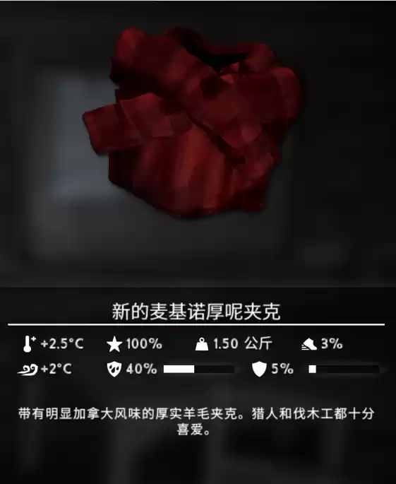 麦基诺厚呢夹克的属性为:保暖+2.5,抗风+2,防水40%,护甲5%,减少冲刺3%,重量为1.5公斤。