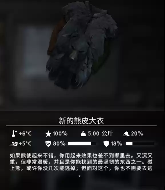 从属性上看,熊皮大衣提供6点保暖5点抗风,防水80%,护甲18%,但是减少20%冲刺,这件衣服简直就是战场上用的盔甲,笨重,防御高,保暖强,入侵者模式后期天气衰变到*差(50天后)必备,其它模式下一般来说用不到这件衣服。