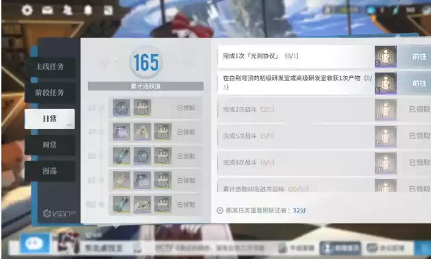 下面在阶段任务界面下方,我们可以看到每日刷新的日常任务和每周刷新一次的周常任务,这些任务指引着玩家们完成各种重要的游戏内容的体验过程,每次完成任务都能积累活跃度。达到每一层活跃度都能给玩家们提供大量执行官经验,所以在完成阶段任务的同时玩家们切记要按照日常任务和周常任务的要求完成任务,解锁更高活跃度并获得尽可能多的奖励。