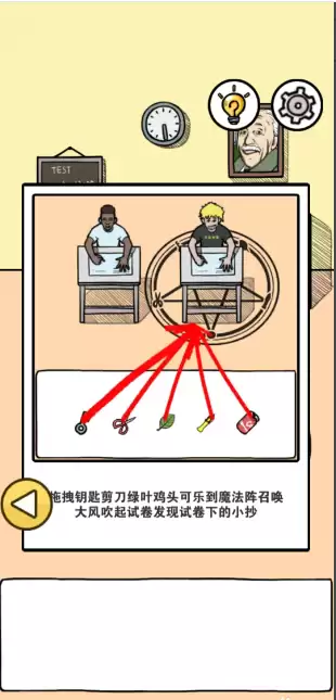 拖拽钥匙、剪刀、绿叶、鸡头、可乐到魔法阵,召唤大风吹起试卷发现试卷下的小抄。