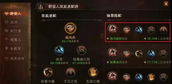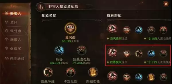 1、技能搭配1—旋风速刷流派:狂乱 旋风击 疾奔 狂暴者之怒 不灭之怒。野蛮人这个技能搭配比较适合用来刷怪,玩家可以参考下图。