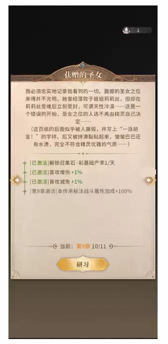 其中有一本特殊的书:获赠的圣女,只有解锁了它才能获得彩色召集石,是日常彩色召集石唯一的来源。彩色召集石可以产出钻石与高阶成员,因此越早解锁这个效果越好。