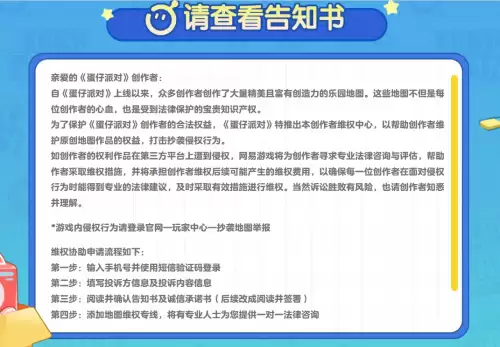 这一现象给蛋仔原创地图作者带来了很大的困扰,在了解到这样的情况后,游戏最新迅速推出创作者维权中心,旨在有效保障创作者权益,让玩家能够更方便快捷地运用法律武器保护自己的原创知识产权。