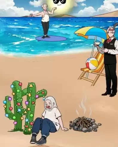 9.连续点击爷爷冲浪板下的浪花,最后一个位置是非常难的,很多玩家都找不到这个位置在哪,这个需要玩家们连续点击老爷爷脚下的冲浪板,这样就能够让老奶奶喝上水啦。