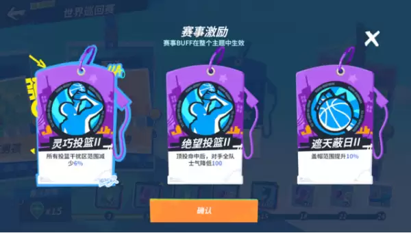 并且,在“世界巡回赛”中,玩家可以选择强力buff助力自己提升。当玩家解锁赛事激励节点后,就可以可在随机出的3个buff中选择1个,在所有关卡中生效,这意味我们可以拥有一个覆盖全场的强力buff加成,不论是增加盖帽范围、减少干扰区,还是其他类型的buff,都会对我们的角色强度有着不错的提升。