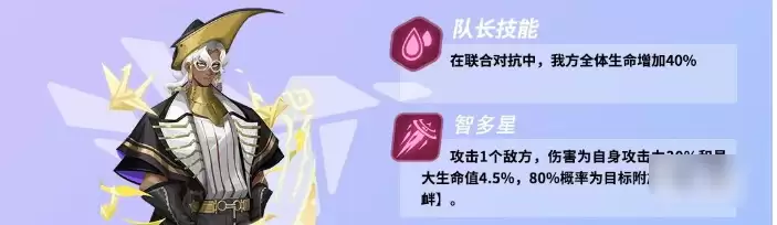 艾略特属于托特神格,擅长进行控制,通过提升阶段可以增加防御、生命值、速度、技能增强等效果。当成为队长时,可以在联合对抗过程中为我方全体角色添加40%的生命值。虽然提高的生命值属性可观,但是只在联合对抗中生效,这一点就和其他角色有了区别。如果想要在联合对抗中出彩,完全可以让艾略特成为队长,但在常规作战中却并不合适。