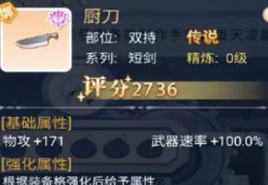 它的基础属性可以增加171的物攻,武器速率为100%,主要作用就是用于切肉,因为在该游戏中玩家可以获得很多肉,他们对于料理图纸来说是比较有用的,有时候会出现在悬赏任务上,要是有抽到就可以快速获得该材料,从而将游戏难度大大降低,对新手玩家来说是比较实用的。