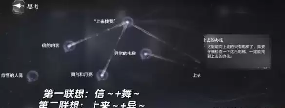 2.先将四个线索按如图一所示进行联想,然后去左边的电梯点调查电梯,千万别选电梯下行了。
