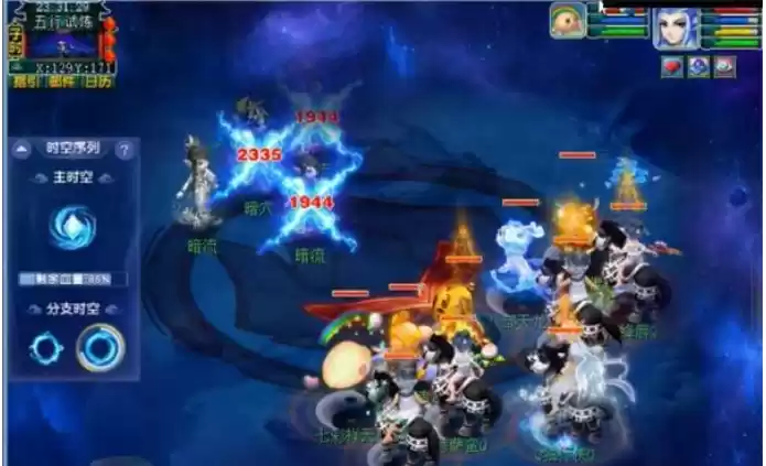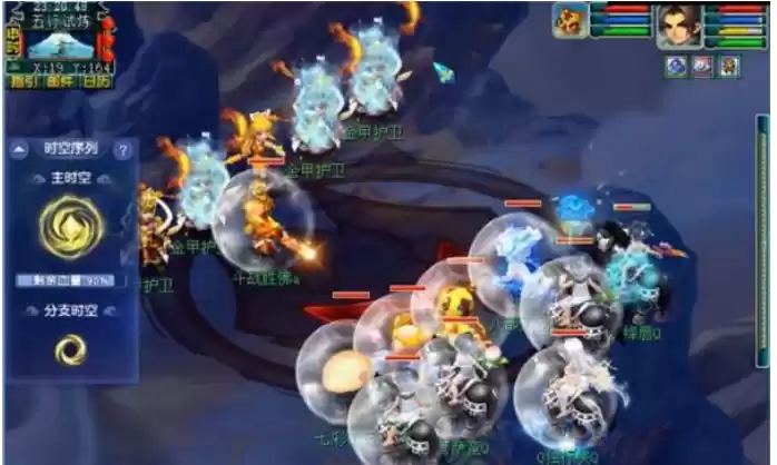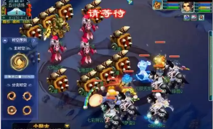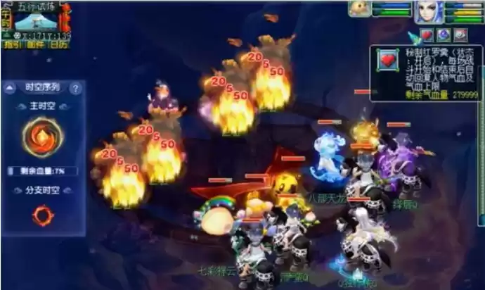 这一场战斗,依然是一个分支时空,主时空主怪无法点选,前排怪物有反震,后排两个凌波城怪物使用浪涌,前排使用裂石,怪物伤害不高,但是血非常高,分支时空主怪在每回合结束后会进行召唤,同时使用一次群法技能。小天观察可以通过击杀分支时空的怪物,让主时空主怪使用火山喷发技能,对敌方自己造成全体伤害,从而提高战斗效率。