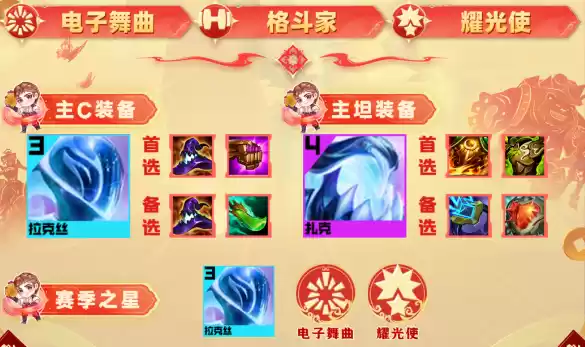 当前版本拉克丝虽然没有加强3星伤害,但是1、2星的技能伤害都有小幅度提升,保证了阵容在中期的过渡。