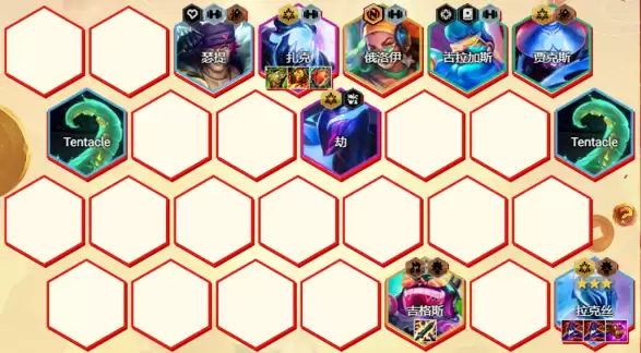 前排格斗一字排开,在拉克丝上面尽量放坦克,拉克丝打角落主C,直接放在斜对角角落,如果是打。