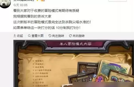 打完所有的章节也就只能获得15个卡包1个黄金卡包和1张金橙两个卡背,而这需要花掉2800金币,减去15包的价值,1个黄金卡包1张金橙和两个卡背值1300金这样算下来感觉上就不会特别亏了,毕竟13包也不可能出个金橙。再加上这次冒险的游戏内容应该会比较丰富,说不定这次冒险内容就足够能让你掏出700金去体验冒险模式的乐趣了,我不认为花一点钱或是肝一点金币去换来游戏乐趣是亏的,凌晨看到王师傅发微博给冒险模式的打分和评价,还蛮高的。