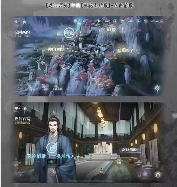 1.去前殿参加宴席中的琼花山西院,点击画面上方月亮,获得文案剧情。
