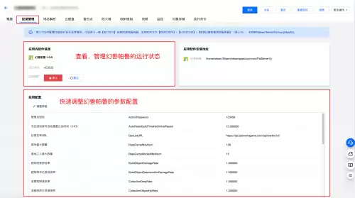 目前,使用幻兽帕鲁应用模板10秒部署的腾讯云轻量应用服务器Lighthouse,可以在实例详情页-应用管理页看到幻兽帕鲁的参数配置面板。