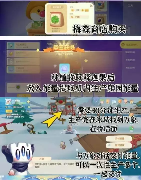 先过引导任务-在主线任务里,做完引导任务后回到后花园,先在梅森店铺购买释迦果,种植完收取果实,放进能量提取机内生产“庄园能量”,半个小时产出,然后收取庄园能量,并交付给万象,总共需要交付90个庄园能量。