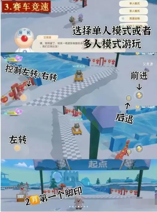 到达起点后与工作摩交互选择单人模式或者多人模式游玩,左边操作杆控制转向“左转或者右转”,右边两个按钮控制前进或者后退,赛道有几处可以抄近道,*快一下可获得20冰域币,随着时间加长,冰域币奖励会逐步减少。