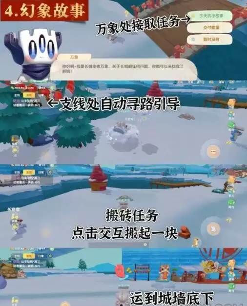 先找到万象领取幻象支线任务,左上角支线任务栏会自动出现任务条,它可以自动寻路引导,首先我们要自己搬砖,将砖头搬到城墙底下即可;然后我们需要请小羊帮忙搬送20块砖,帮助小羊的主人拾取5捆柴火交付给他,即可让小羊帮助我们搬送砖头。运送完即可获得奖励,这个活动会持续7天,每天故事不同。