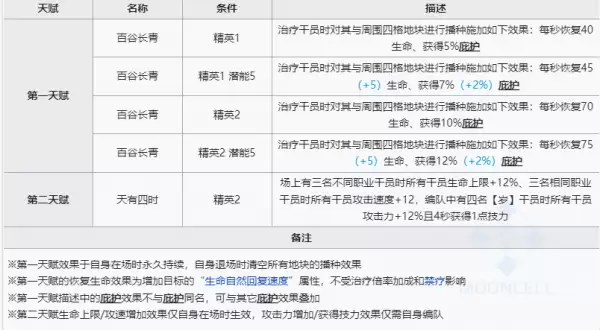 治疗范围扩大,攻击同时可治疗我方干员,攻击力提升,有地面敌人处于播种地块时技能范围内的我方单位攻击力提升、攻击速度提升。