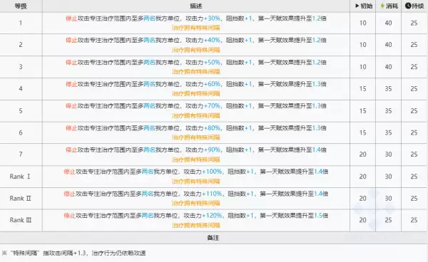 停止攻击。专注治疗范围内至多两名我方单位,攻击力提升,阻挡数增加,*天赋效果提升。