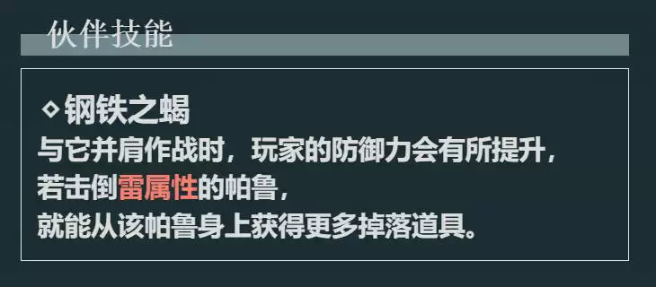 与玩家并肩作战的时候会提升防御力,击倒雷属性帕鲁会得到更多道具。