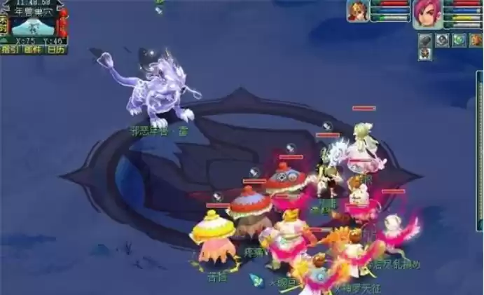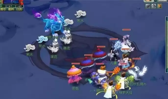 (2)队伍中的两个输出玩家带2爆竹大师+4小白龙的鱼跃龙门,本场战斗打小怪并不会对主怪造成伤害,需要尽早结束战斗,拖的时间越长越不利,有机会就对主怪使用鱼跃龙门技能,小怪被击飞就会对全体造成固定伤害,可以让玩家的爆竹蓄能一直都是满的,只要多出几次暴击,战斗就会结束的很快。