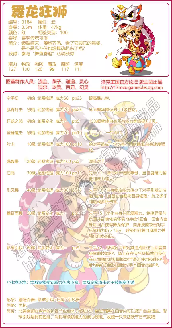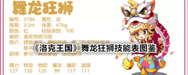 今日小编给大家带来了《洛克王国》舞龙狂狮技能表图鉴分享,春节将至,游戏即将上线不少春节相关宠物,其中舞龙狂狮就是其中之一,可参与“舞鱼春追”活动获得该宠物,下面小编给大家分享一下技能表种族值帮助大家快速了解这个宠物各项信息,感兴趣的速来围观吧!