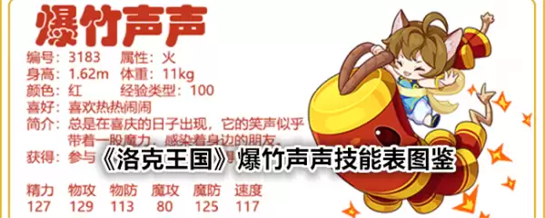 今日小编给大家带来了《洛克王国》爆竹声声技能表图鉴分享,春节将至,游戏即将上线不少春节相关宠物,其中爆竹声声就是其中之一,参与“舞鱼春追”活动获得。下面小编给大家分享一下技能表种族值帮助大家快速了解这个宠物各项信息,感兴趣的速来围观吧!