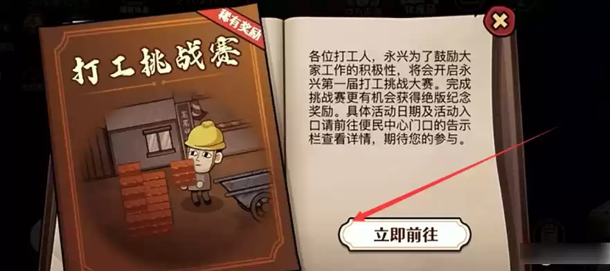 1·首先我们登录游戏,点击进入打工挑战赛,选择“立即前往”,参与挑战就有机会获得绝版纪念币。