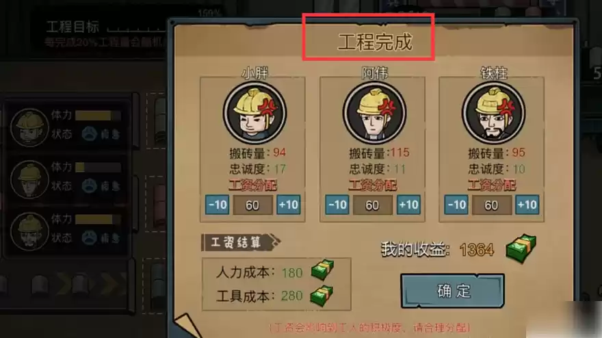 4·等待一段时间工程完成,我们就能成功获得任务奖励,并且顺利通过打工者挑战。