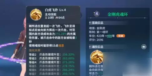 不同年份的金刚虎魂环带来的加成效果不同。例如,300年的金刚虎魂环可以提升技能伤害,增加攻击力。而将魂环升级至423年,则能延长眩晕技能的时间。为了让金刚虎魂环发挥更好的效果,玩家需要及时升级年份。如果喜欢金刚虎魂环,可以在猎魂玩法中获得它。