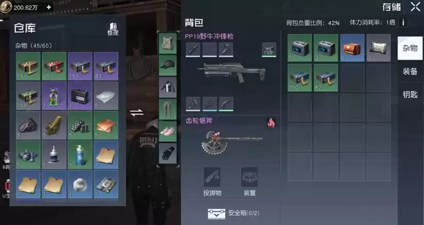 清理背包,将价值不高的物品回收,放入仓库或上架黑市,背包分为杂物、装备和钥匙3个页签,请务必都清理一遍。同时将贵重物品全部存入仓库,记得也要将安全箱清空,否则将会损失2个珍贵的无敌背包位。