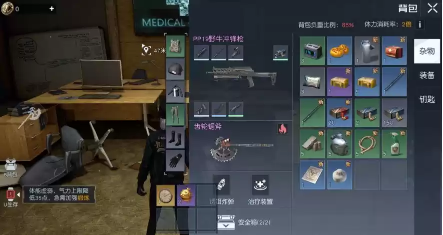 根据战术选择轻装上阵或者全副武装,携带适量的补给品,以保证在禁区中不会处于危险状态。携带物品时需要注意背包容量,携带的物品越多,负重也越多,体力消耗也会更快。