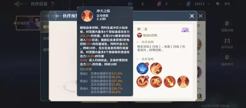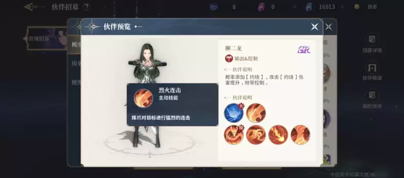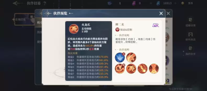 使用柳二龙的时候只要安排这个伙伴出战就可以给大家带来暴击提升1%的效果,在sr伙伴里面大多数伙伴都是只有一个出战效果的,只有SSR的角色才有两个效果,但是柳二龙是*的一个特例,他还有第二个出战天赋是暴伤提升1%的加成,而且使用柳二龙它是有概率添加灼烧状态的,攻击有灼烧之后伤害会提升,附带控制的效果,不过在普攻上面是没有这类加成效果的,她的普攻烈火连击是挥爪对目标进行猛烈的连击,柳二龙的输出以及控制效果强度主要还是在下面的几个技能上面。