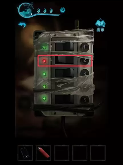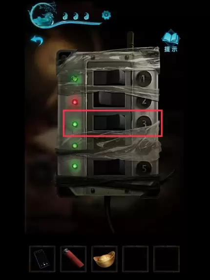 第1步:在【六宝阁】柜台上拾取到”打火机“,”收银台的书“中内容包含很多不同谜题的线索;将柜台上灯光开关的”2号开关“关闭,就能够在黑暗中区分出”发光的元宝“;这是要注意的是,二号灯没打开之前是暗的,打开以后退出开关排插界面能很明显的发现有一个小元宝冒着蓝色的光,点击即可获得,如下图所示