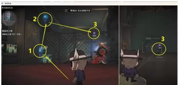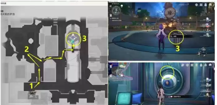 9.完成拼图后,从左边1机关传送到2机关位置后去3花瓶位置,然后调查3花瓶选择推动,将3花瓶推下去打掉4怪物,然后在从3花瓶位置,从2机关传送回到下面1机关位置。