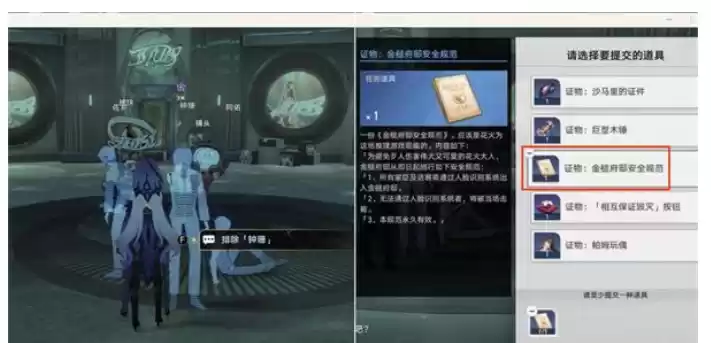 11.上图最后3位置调查后,会来到下图位置,先选择排除钟珊后提交第3个证物安全规范。