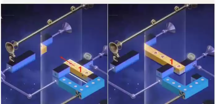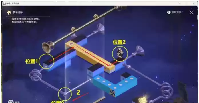 23.最后再将1黄色模块拖拽移到下图位置,路线就会连通,钟表小子就会自动从2位置移动到3位置,解密完成,退出后再选择唤醒即可。