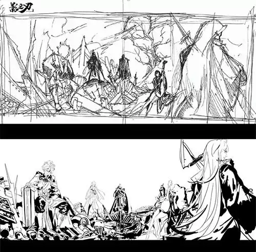 与此同时,随着对传统美学深入理解与学习,佩佩也从最初的结合东西方美学,以传统美学的色彩为基础并且注重透视和造型的准确严谨的创作风格,转变为目前《影之刃3》以“气韵生动”为主的意境表现风格。她在创作上运用中国画“线条”的主要表现手法,利用线条的变化并充分结合故事背景、剧情发展、人物关系等勾勒出生动而灵活的作品。最终再以水墨色彩的冷峻色调使作品呈现了朦胧且意境十足的江湖味道。