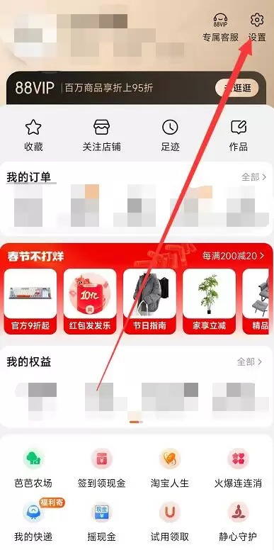 1、底部菜单栏【我的淘宝】,右上角设置。