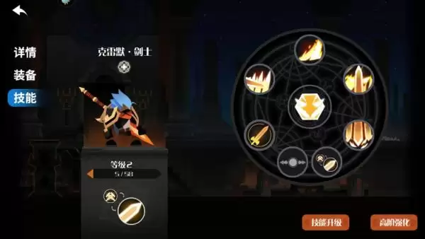 1、首先我们进入到游戏的技能界面,如下图,可以通过升级和高阶强化来提升技能等级