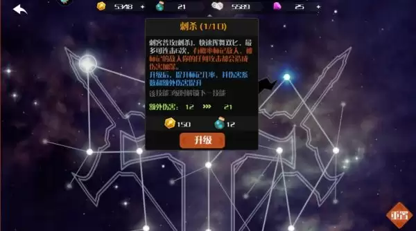 2、进入到如下界面后,点击相应的技能直接升级就可以了,每次消耗的技能点需要任务和闯关获取