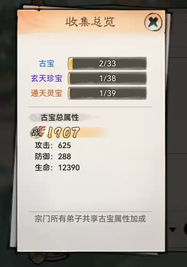 古宝界面左下角的【总览】,可以查看古宝收集进度,了解当前古宝属性加成。