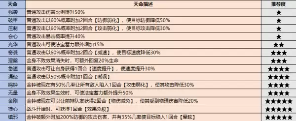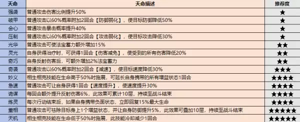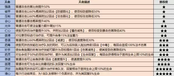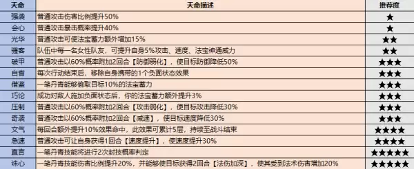 只有绝伦以上的高品质弟子才会自带天命,天命技能也有优劣之分,这里整理了一下各职业的天命排行,大家可以参考一下。值得注意的是,紫色弟子也可以通过服用九转金丹获得天命效果。