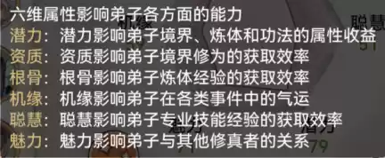 最后是看六维,弟子的品质越好,弟子的六维总和就越高,对于战斗弟子来说六维中占比重*高的就是潜力,六维在后期的时候可以通过丹药来提升,当六维总值超过365时就会变成红色逆天品质。