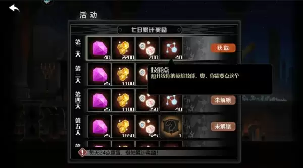 4、如下图,每天登陆都可以获得魂石、金币、精华和技能点奖励