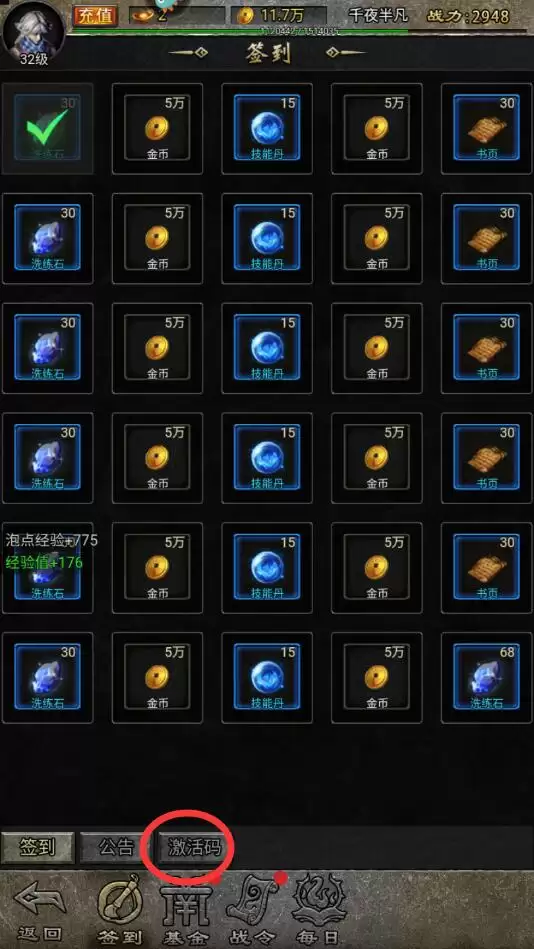 2、进入到游戏的福利界面后就会看到签到、公告、激活码选项了,我们点击对应的菜单