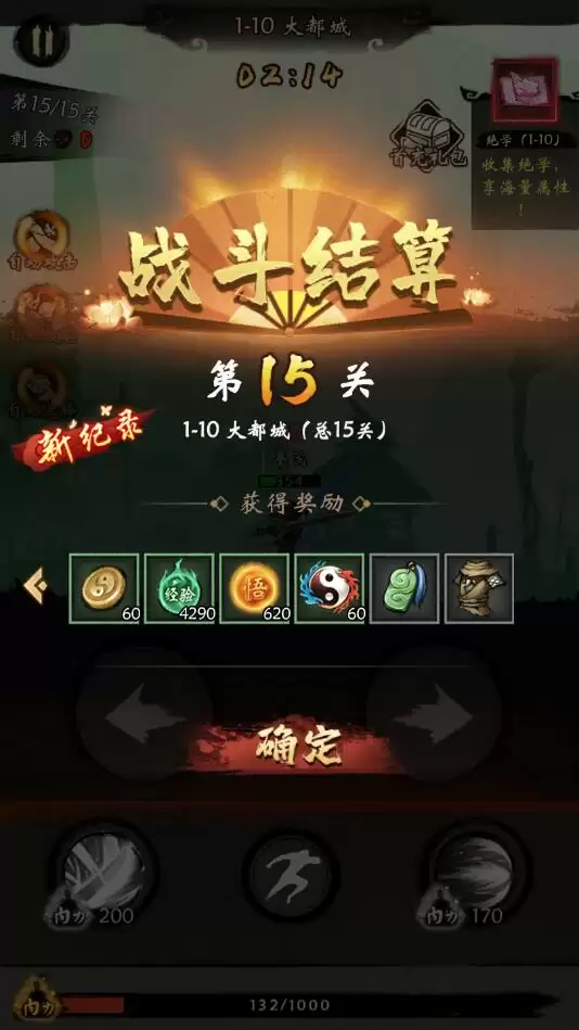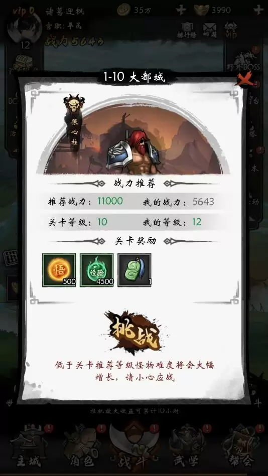 2、战斗时我们可以将自动模式开启,每次挑战成功都可以获取升级经验