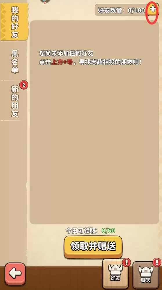 2、然后就会进入到“我的好友”界面了,默认好友是空的,点击上方“+”号添加好友