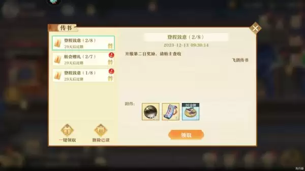 5、最后回到游戏主界面找到“传书”按钮,进入后点击领取就可以获得珍珠、书谱研习券等奖励了
